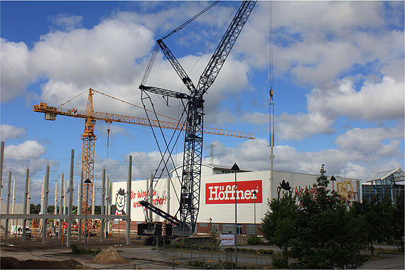 Seit einigen Wochen drehen sich wieder Baukräne im Gewerbepark! Im südlichen Bereich wird intensiv an der Erweiterung des Höffner-Möbelkaufhauses gearbeitet. Tag für Tag wächst der Anbau auf einer Grundfläche von etwa 4.000 m². Im Frühjahr 2018 erfolgt dann die Verbindung mit dem 1996 eröffneten Kaufhaus, das im Zuge dieser Maßnahme umfassend modernisiert, verschönert und so für die nächsten 20 Jahre fit gemacht wird.
