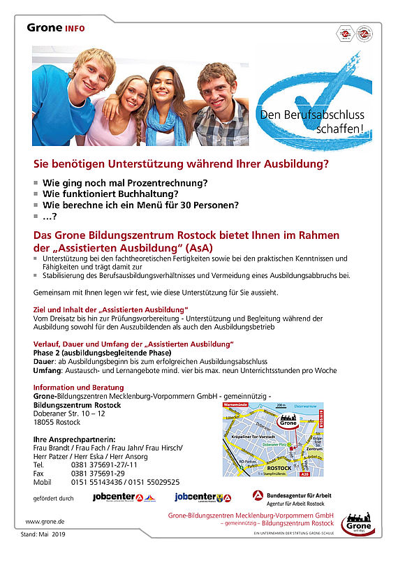 Sowohl die Jugendlichen als auch die Ausbildungsbetriebe werden durch einen Bildungsträger, wie das Grone Bildungszentrum Rostock, regelmäßig unterstützt und begleitet, um einen guten Verlauf der Ausbildung zu ermöglichen.